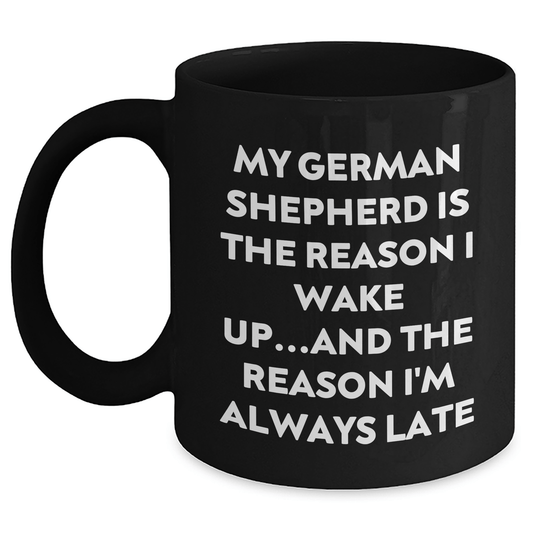 Funny German Shepherd Dog Lover Gifts from Men to Family - My German Shepherd Is The Reason I Wake Up...and The Reason I'm Always Late Quote Black Coffee Mug
