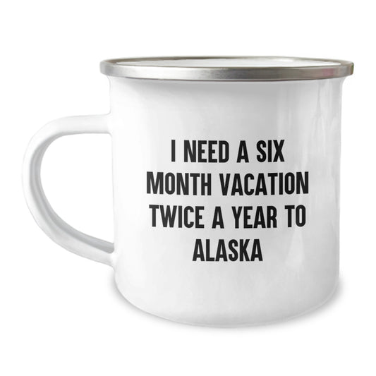 Alaska Camping Mug, Funny Quote Gifts from Friends to Family, Unique Christmas Unique Gifts for Men and Women, I Need A Six Month Vacation Twice A Year To Alaska