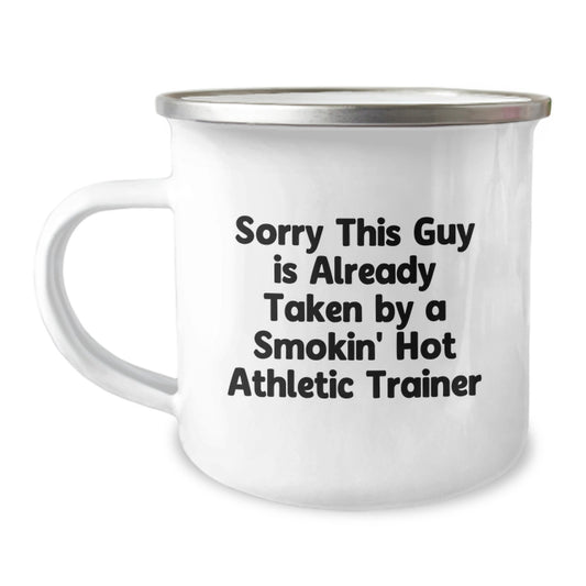 Funny Athletic Trainer Camping Mug Gifts from Friends to Graduating Athletes - Sorry This Guy Is Already Taken By A Smokin' Hot Athletic Trainer