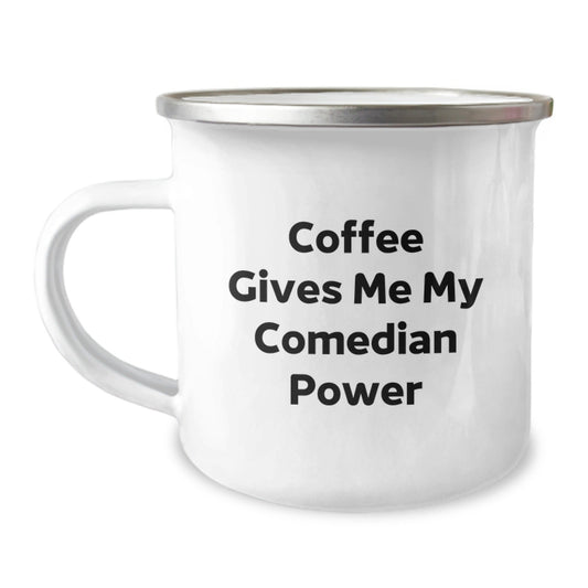 Comedian Gifts from Friends, Funny Camping Mug for Graduation, 'Coffee Gives Me My Comedian Power' Quote, 12 oz Stainless Steel with Enamel Finish