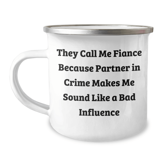 Funny Fiance Gifts for Him, Camping Mug with Quote 'They Call Me Fiance Because Partner In Crime Makes Me Sound Like A Bad Influence', Unique Graduation Gift from Friends or Family