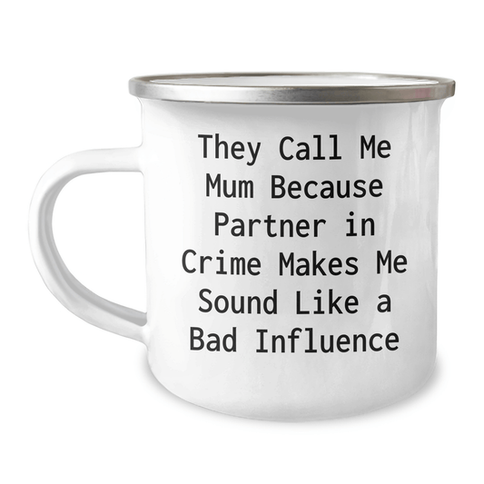 Funny Mum Camping Mug, They Call Me Mum Because Partner In Crime Makes Me Sound Like A Bad Influence, Father's Day Unique Gifts from Mum to Men, 12 oz Stainless Steel with Enamel Finish