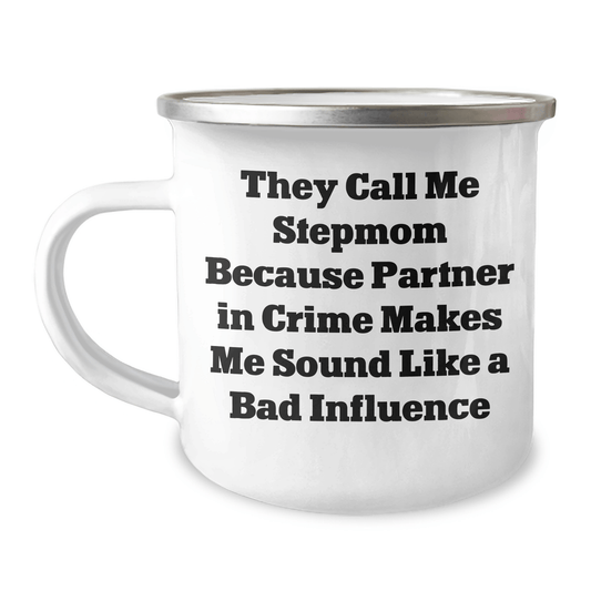 Funny Stepmom Gifts for Her, They Call Me Stepmom Because Partner In Crime Makes Me Sound Like A Bad Influence, 12 oz Camping Mug for Graduation