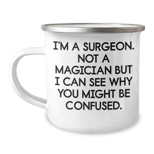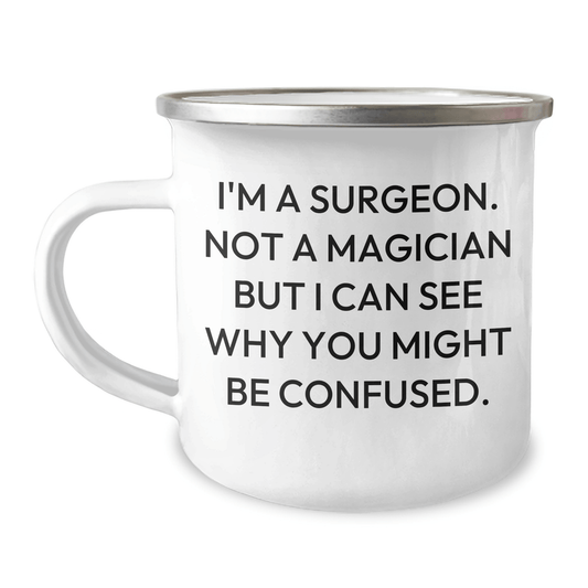 Surgeon Gifts from Family to Friends, Funny Camping Mug for Graduation, 'I'm A Surgeon. Not A Magician But I Can See Why You Might Be Confused.', 12 oz Stainless Steel with Enamel Finish