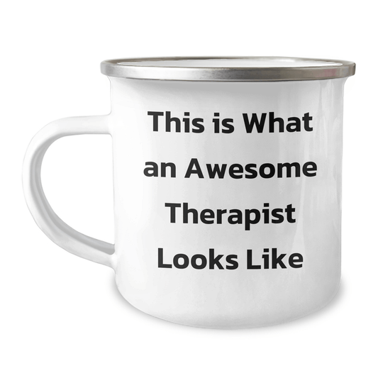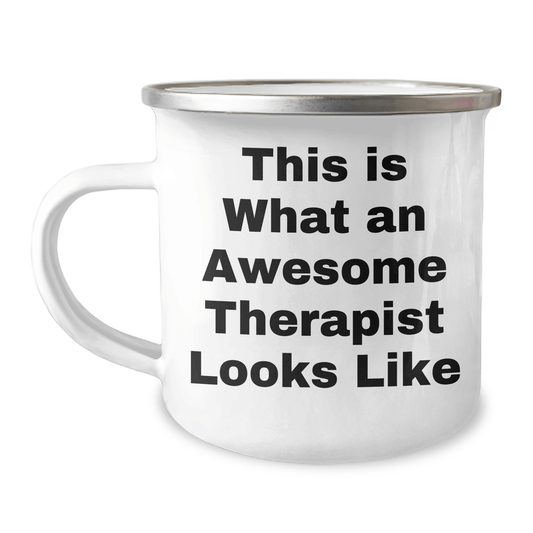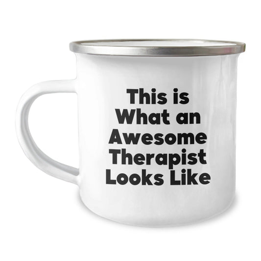 Funny Therapist Gifts from Friends for Graduation - 'This Is What An Awesome Therapist Looks Like' Quote on Camping Mug, 12 oz Stainless Steel with Enamel Finish