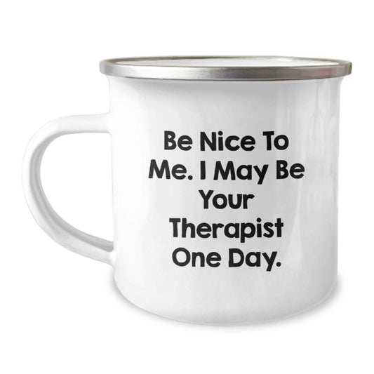 Funny Therapist Gifts from Friends and Family - Be Nice To Me. I May Be Your Therapist One Day. - 12 oz Stainless Steel Camping Mug for Graduation