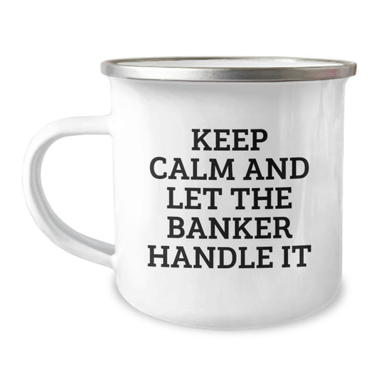 Funny Banker Christmas Unique Gifts from Friends to Coworkers Camping Mug, Keep Calm And Let The Banker Handle It, 12 oz Stainless Steel Enamel Finish