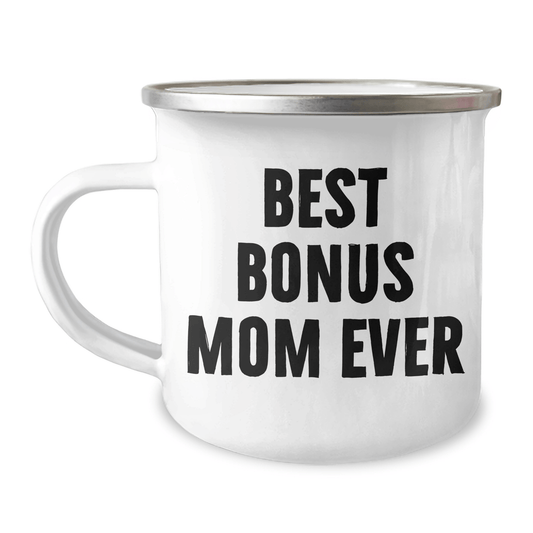Gifts from Family to Bonus Mom Ever - Funny Camping Mug for Father's Day, Best Bonus Mom Gifts, 12 oz Stainless Steel with Enamel Finish, Permanent Printing