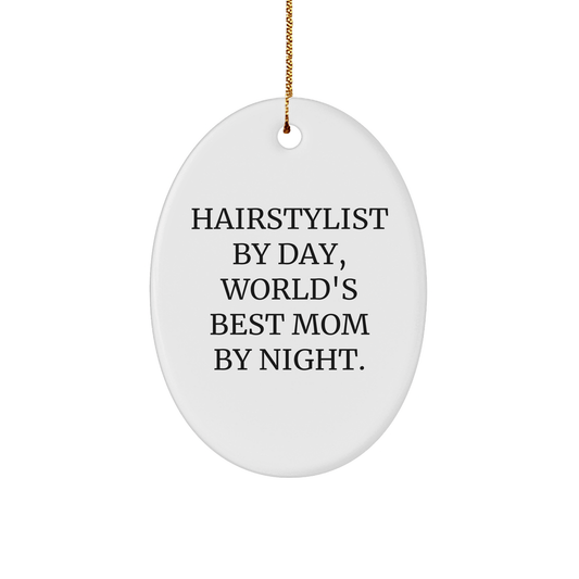 Hairstylist Gifts from Friends - Hairstylist By Day, World's Best Mom By Night. Oval Ornament for Christmas