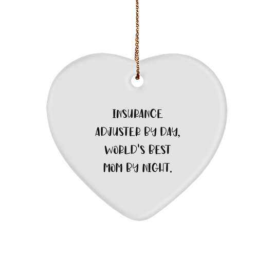 Insurance Adjuster Gifts for Christmas - 'Insurance Adjuster By Day, World's Best Mom By Night.' Heart Ornament, Funny Quote, White, Heart Shaped, 2.75" tall, Gifts from Mom for Insurance Adjuster