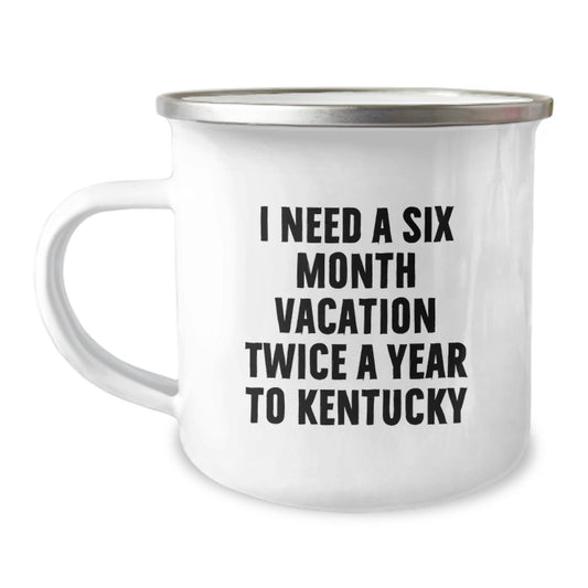 Kentucky Lover's Camping Mug, Funny Gift for Friends, Family, or Coworkers from Kentucky, 'I Need A Six Month Vacation Twice A Year To Kentucky' Christmas Unique Gifts