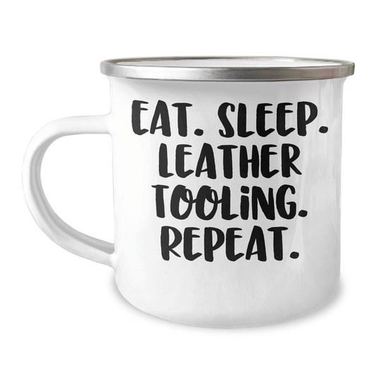 Leather Tooling Enthusiasts' Camping Mug, Funny Gift from Family, Friends, Coworkers, or Men on Father's Day - Eat. Sleep. Leather Tooling. Repeat.
