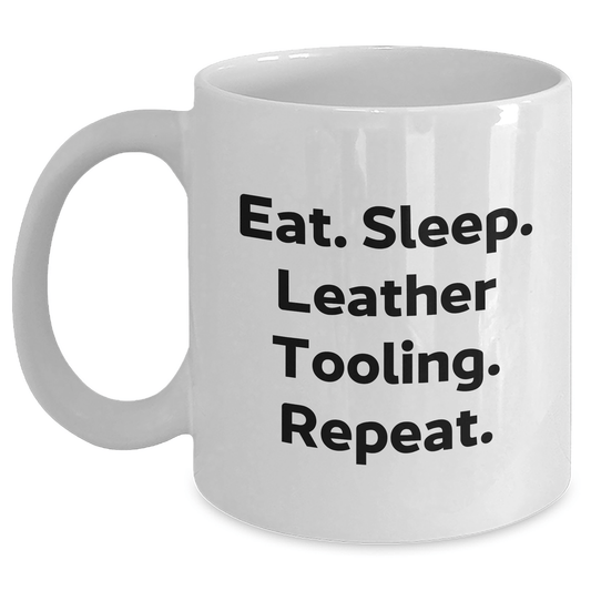 Leather Tooling Lovers' White Coffee Mug, Funny Gifts from Family for Dad, Eat. Sleep. Leather Tooling. Repeat. on Father's Day