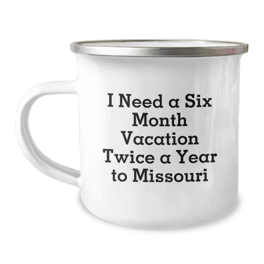 Funny Gifts from Friends to Missouri Enthusiasts, 'I Need A Six Month Vacation Twice A Year To Missouri' Stainless Steel Camping Mug, Unique Christmas Unique Gifts for Men Women Family