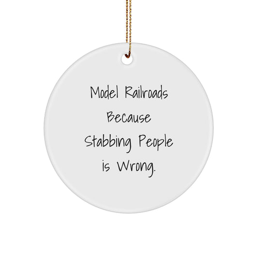 Funny Model Railroads Gifts from Men to Friends - Circle Ornament with Model Railroads Because Stabbing People Is Wrong. quote for Christmas