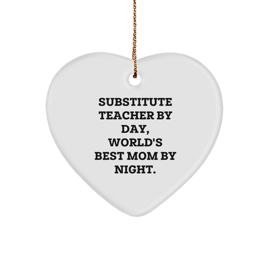 Substitute Teacher Gifts from Family - Heart Ornament for Christmas with Funny Quote, 'Substitute Teacher By Day, World's Best Mom By Night.'
