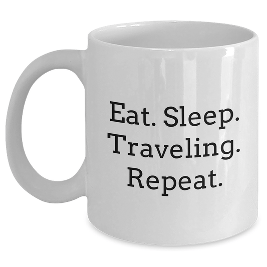 Traveling Enthusiasts' Funny Gifts from Friends for Women and Men, Eat. Sleep. Traveling. Repeat. White Coffee Mug