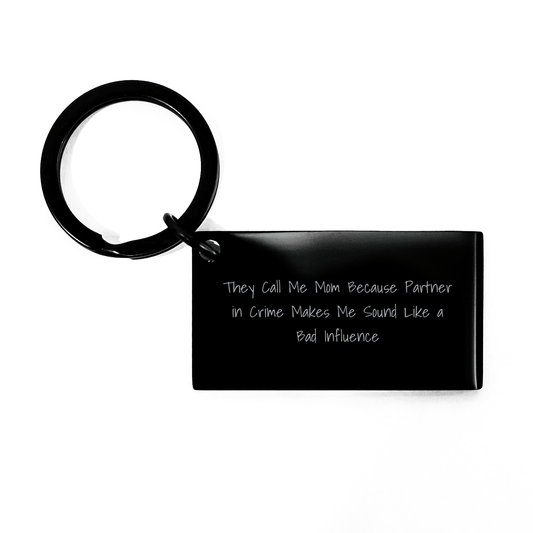 Funny Mom Gifts from Friends for Graduation Keychain, 'They Call Me Mom Because Partner In Crime Makes Me Sound Like A Bad Influence', Stainless Steel, Black, 1.57 x 0.87 inches