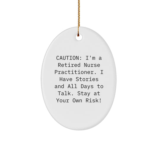 Gifts from Friends to Nurse Practitioner - 'Caution: I'm A Retired Nurse Practitioner. I Have Stories And All Days To Talk. Stay At Your Own Risk!' Oval Ornament for Christmas