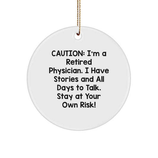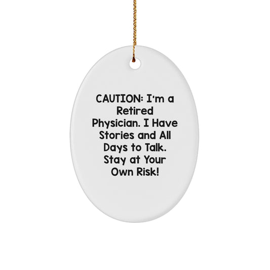 Funny Physician Oval Ornament Gifts from Friends for Christmas - 'Caution: I'm A Retired Physician. I Have Stories And All Days To Talk. Stay At Your Own Risk!'