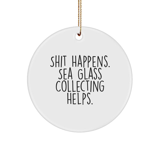 Funny Sea Glass Collecting Gifts for Friends, 'Shit Happens' Circle Ornament, White, Christmas Unique Presents from Family