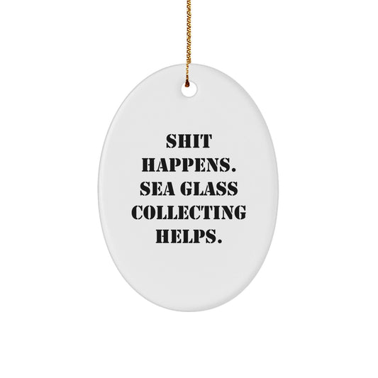 Sea Glass Collecting Humor Gifts from Friends, Funny Oval Ornament for Women, Gifts for Sea Glass Collecting Enthusiasts, Christmas Unique Gifts, White Oval Shaped Ornament with Shit Happens Quote
