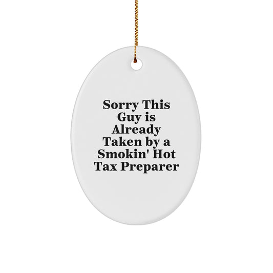 Funny Tax Preparer Gifts from Friends - Sorry This Guy Is Already Taken By A Smokin' Hot Tax Preparer Oval Ornament for Christmas