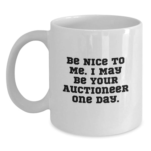 Funny Auctioneer Gifts, Be Nice To Me. I May Be Your Auctioneer One Day. White Coffee Mugs for Auctioneer Birthday, Gifts from Men to Auctioneer Friends