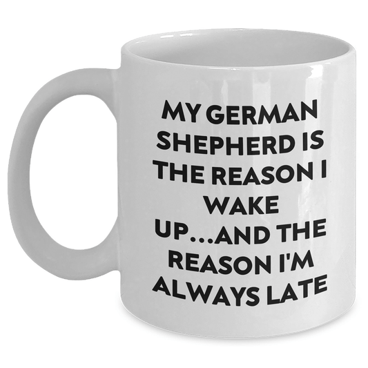 Funny German Shepherd Dog Gifts for Men - White Coffee Mug, 'My German Shepherd Is The Reason I Wake Up...and The Reason I'm Always Late' Funny Quote, Great Father's Day Unique Gifts from Men