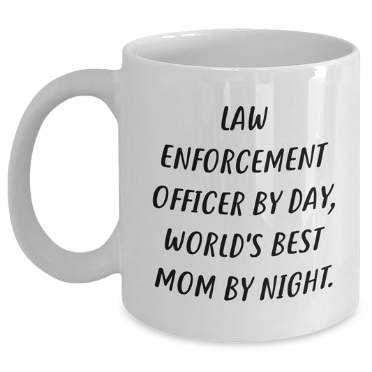 Law Enforcement Officer Humor White Coffee Mug, Funny Gifts from Mom to Law Enforcement Officer on Father's Day, 'Law Enforcement Officer By Day, World's Best Mom By Night.'
