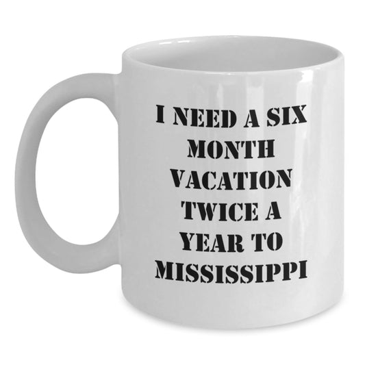 Mississippi Enthusiasts Gifts from Friends for Graduation - 'I Need A Six Month Vacation Twice A Year To Mississippi' Funny White Coffee Mug