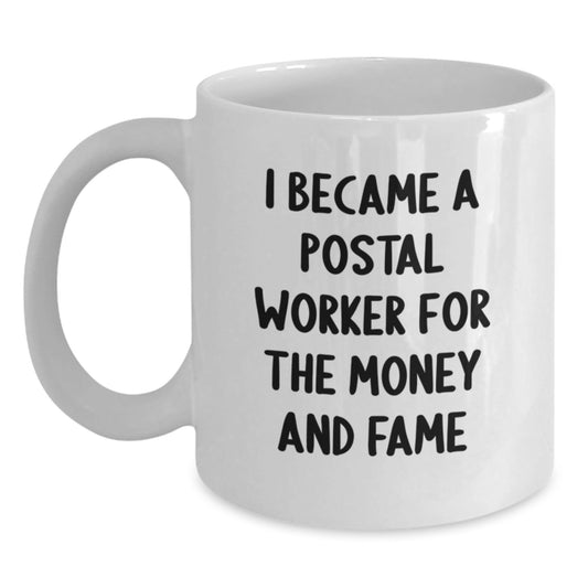 Funny Postal Worker Gifts from Friends for Graduation Unique White Coffee Mugs - 'I Became A Postal Worker For The Money And Fame' Quote