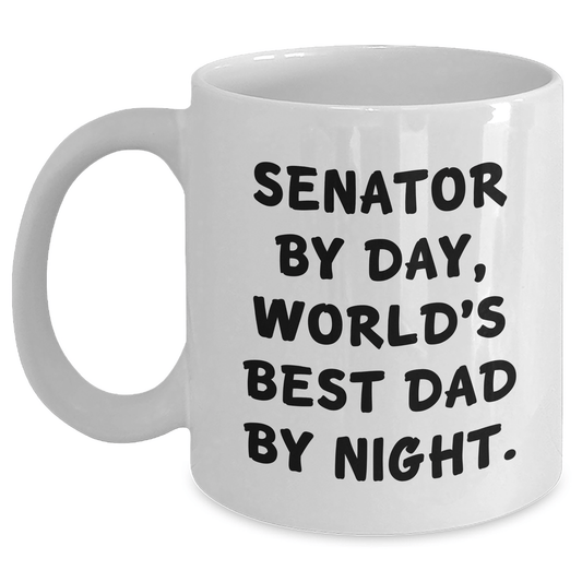 Funny Senator Gifts for Mom - 'Senator By Day, World's Best Dad By Night.' White Coffee Mug