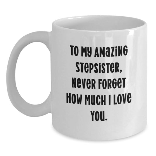 Funny Stepsister Gifts from Mom to Amazing Stepsister on Graduation, 'To My Amazing Stepsister, Never Forget How Much I Love You.' White Coffee Mug