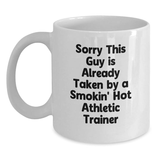 Funny Athletic Trainer Gifts from Friends for Men - Sorry This Guy Is Already Taken Quote White Coffee Mug, 11oz or 15oz Capacity, Ceramic, Microwave, Dishwasher Safe