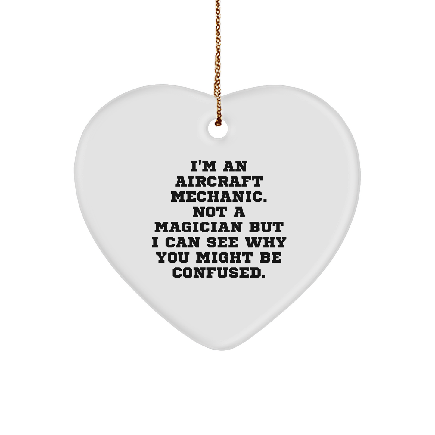 - Este adorno de corazón es el regalo ideal para cualquier mecánico de aviones, ya sea para Navidad o simplemente porque sí. La divertida frase: «Soy mecánico de aviones. No mago, pero entiendo por qué podrías estar confundido» le sacará una sonrisa y le hará sentir apreciado.