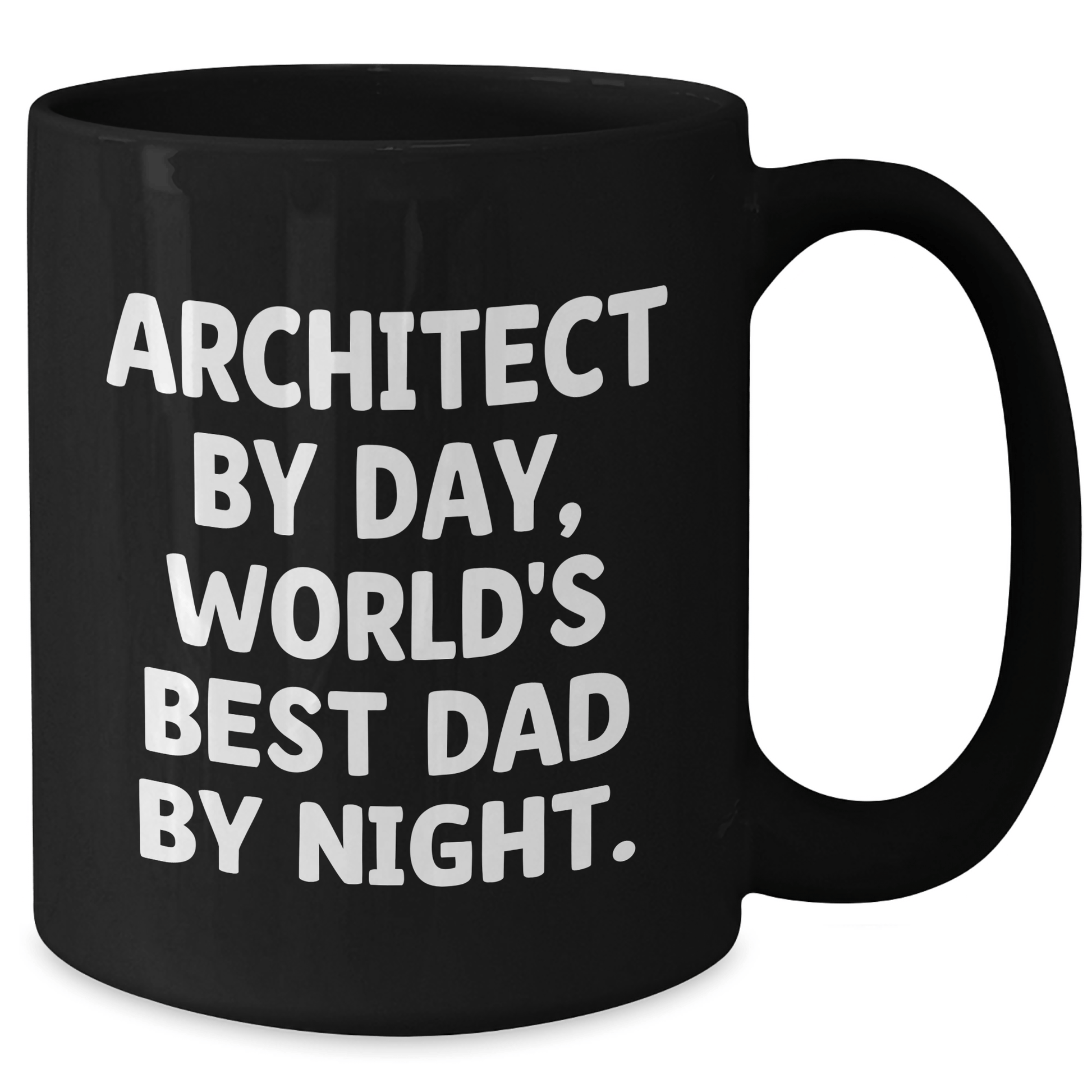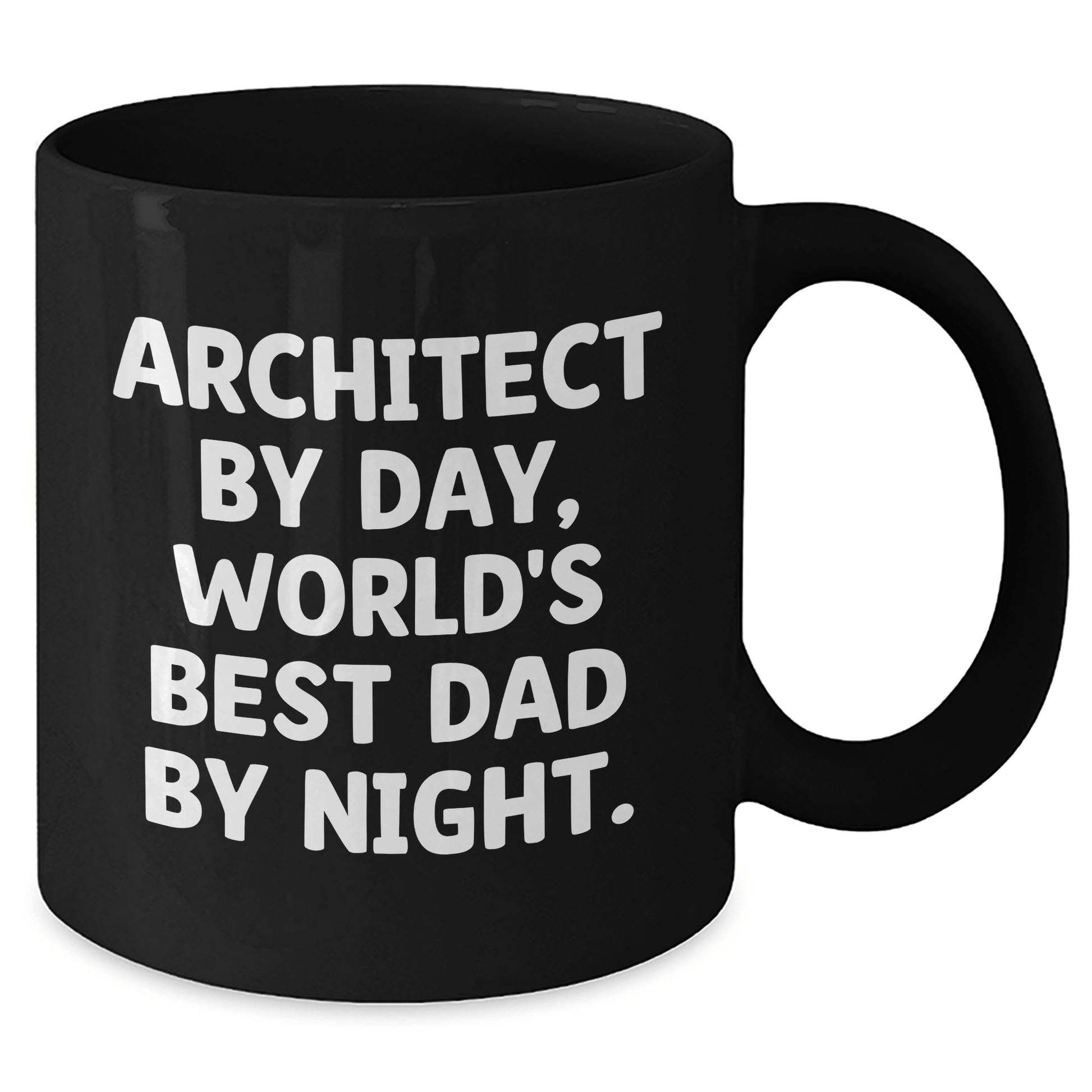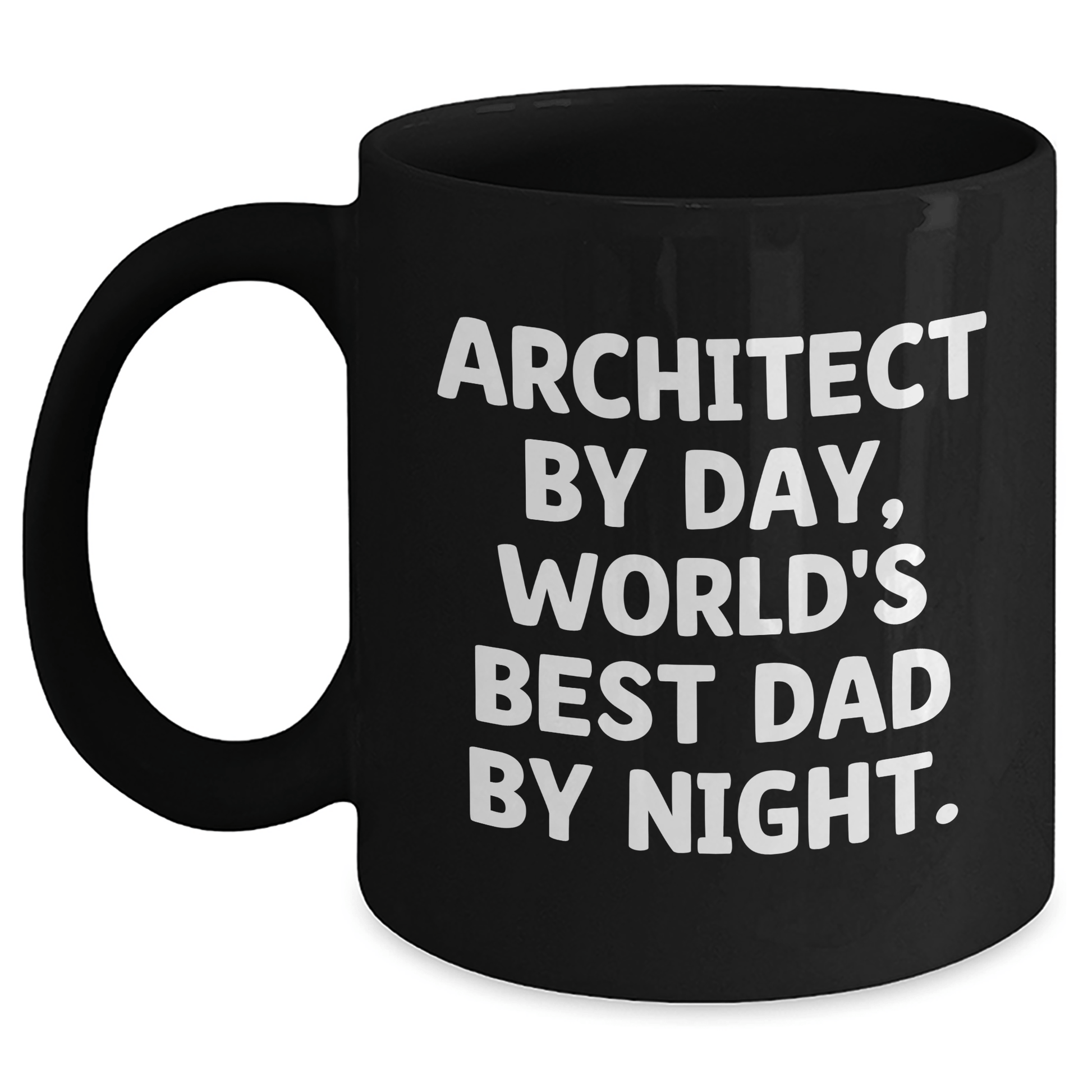 - Muestra tu lado profesional como arquitecto con esta taza de café negra, perfecta para disfrutar del café de la mañana mientras planificas tu próximo gran proyecto o celebras una graduación con amigos y familiares. La frase «Arquitecto de día, el mejor papá del mundo de noche» añade un toque de humor y personalidad a tu día a día.