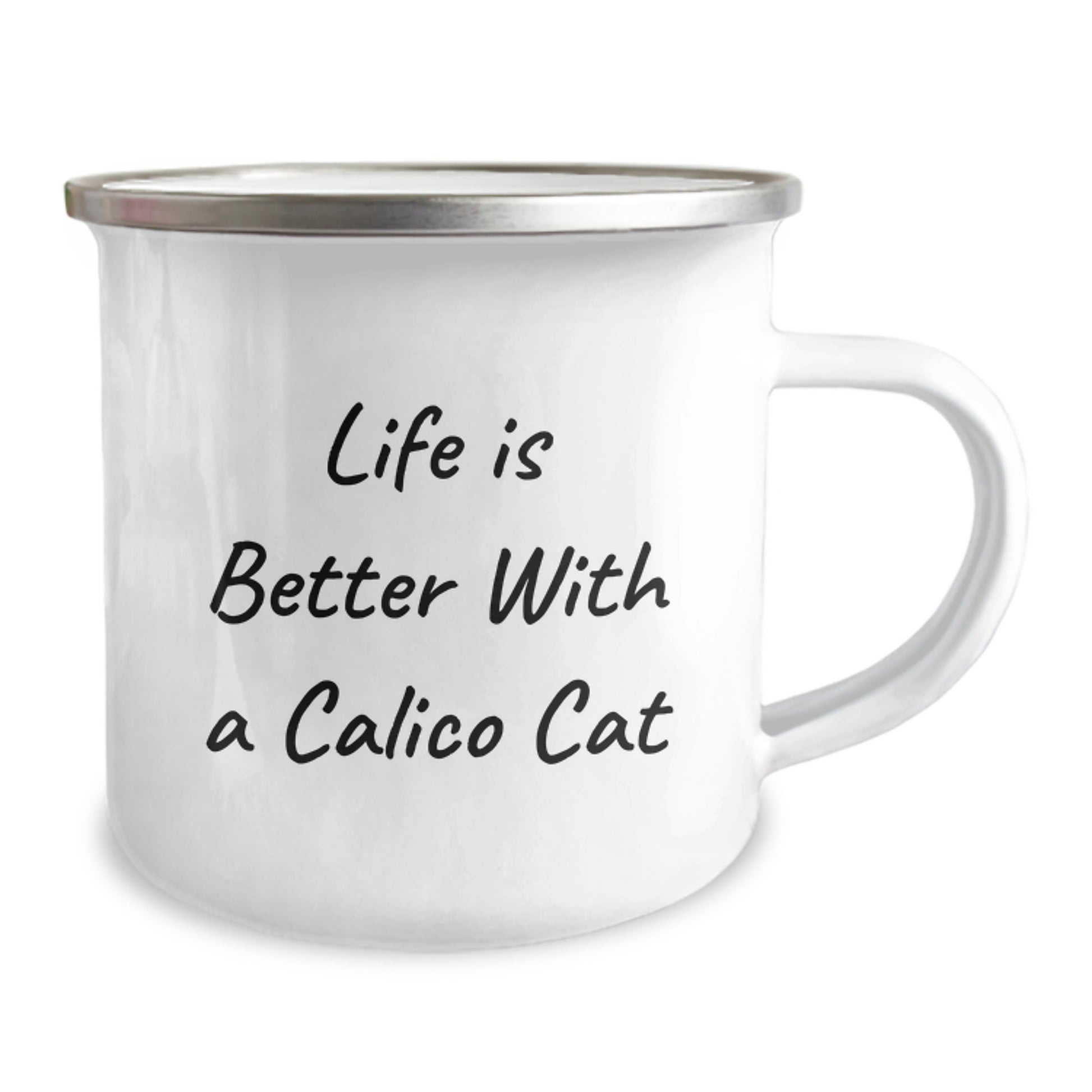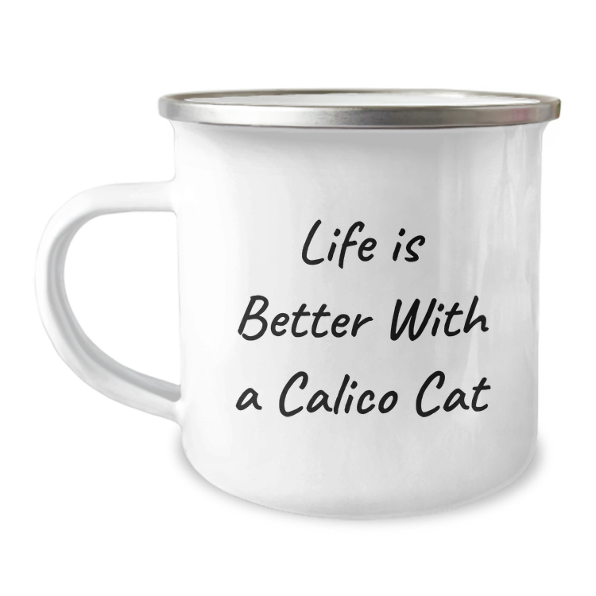 - Esta taza de camping con diseño de gato calicó es un regalo ideal para amigos y familiares amantes de los gatos calicó. Es la manera perfecta de celebrar un cumpleaños o cualquier ocasión especial con tus seres queridos. La taza de acero inoxidable de 355 ml (12 oz) tiene el tamaño perfecto para cualquier amante del café o el té, y su acabado esmaltado es resistente y fácil de limpiar.