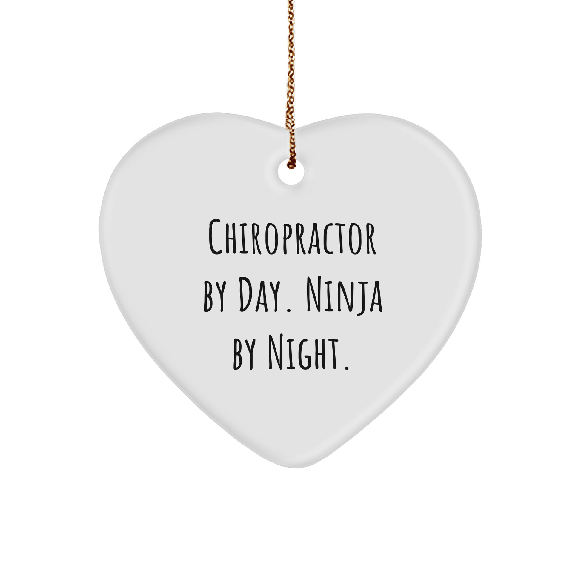 - "Quiropráctico de día. Ninja de noche". ¡Un regalo único y considerado para el quiropráctico de tu vida! Este adorno de corazón está diseñado específicamente para mostrar aprecio por su arduo trabajo y dedicación al servicio de los demás. Con sus vibrantes colores y su diseño en forma de corazón, este adorno sin duda le sacará una sonrisa.