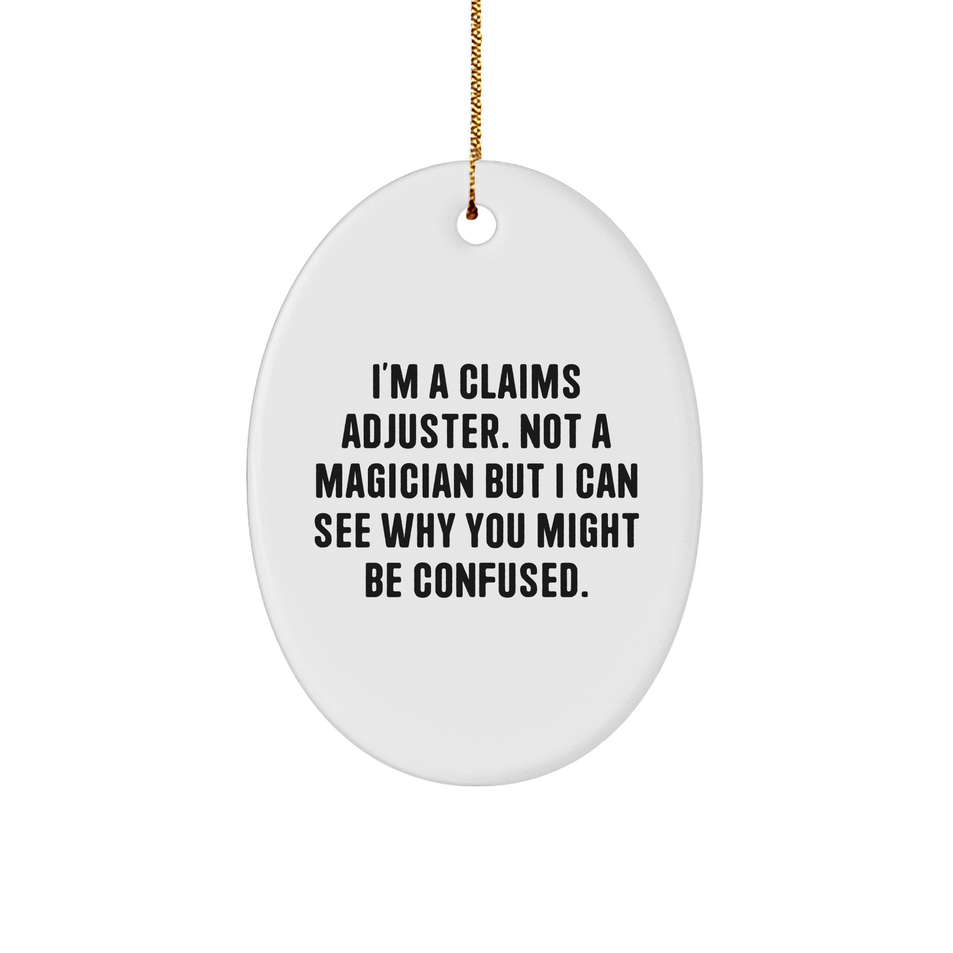 ¿Eres ajustador de siniestros y buscas un regalo original de tus amigos o compañeros de trabajo? ¡No busques más! Este adorno ovalado es un regalo divertido y considerado para estas fiestas. La cita del adorno dice: «Soy ajustador de siniestros. No soy mago, pero entiendo por qué podrías estar confundido», lo que sin duda le sacará una sonrisa a cualquier ajustador de siniestros.