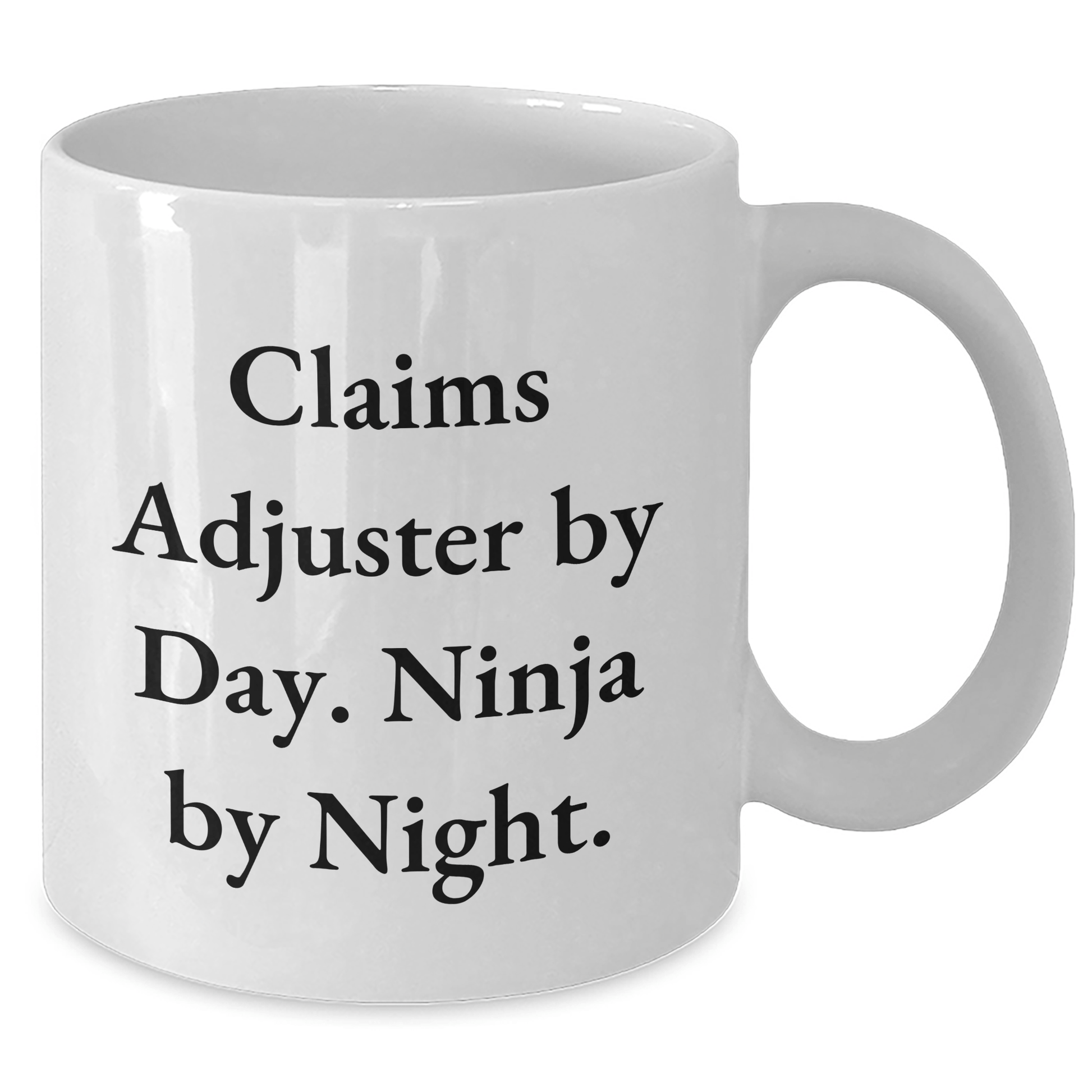 - Haga una declaración con nuestra cita única 'Ajustador de reclamos de día. Ninja de noche' en esta taza de café blanca, perfecta para el graduado que busca iniciar su carrera en el ajuste de reclamos o para el profesional experimentado que busca una forma divertida de mostrar su profesión.