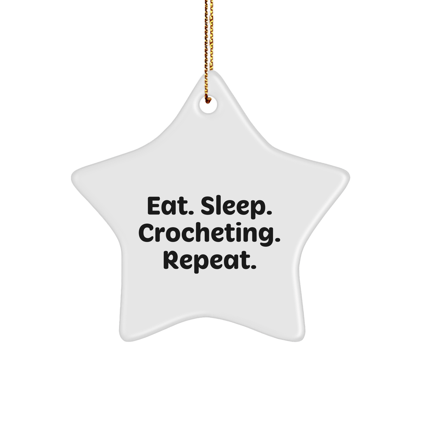- Este adorno de estrella blanca "Comer, dormir, tejer y repetir" es un regalo único y especial para amigos, familiares o compañeros de trabajo que comparten tu pasión por el crochet.