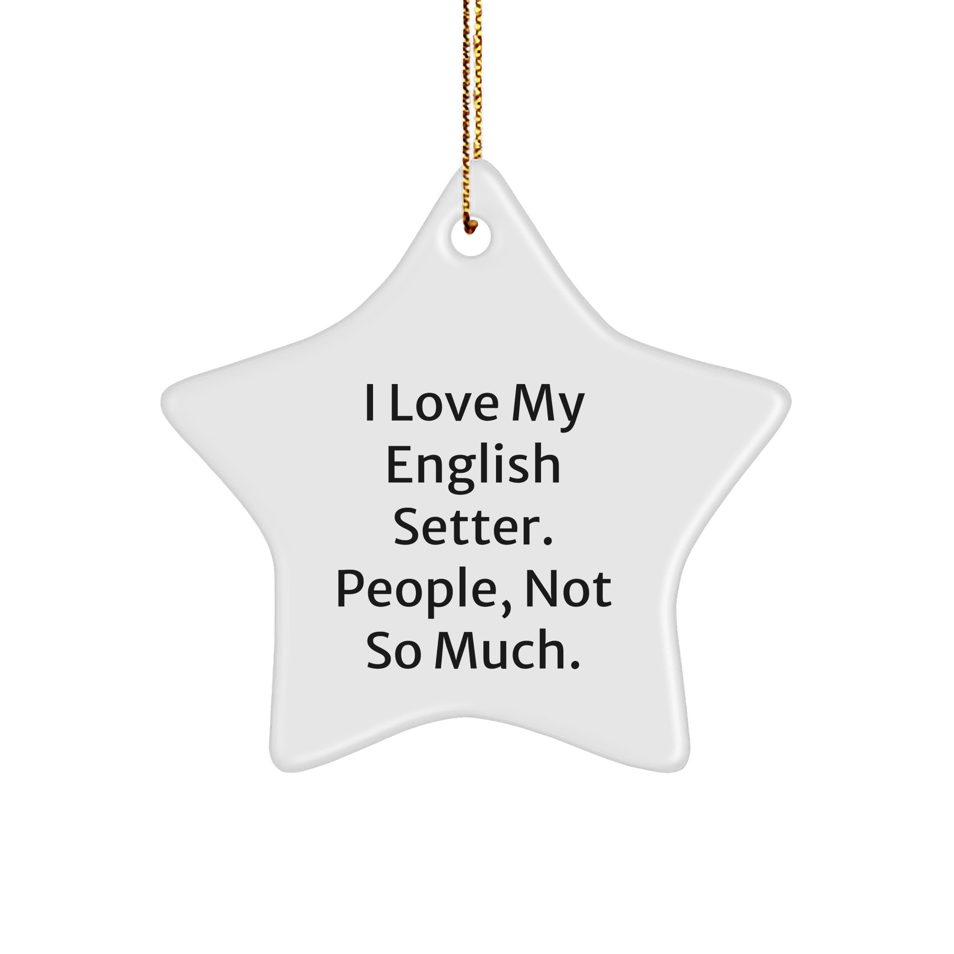 - Expresa tu amor por tu setter inglés con este original adorno de estrella, un regalo ideal para cualquier dueño o aficionado. La frase "Amo a mi setter inglés. A la gente, no tanto" le da un toque divertido a tu decoración navideña. Perfecto para colgar en el árbol, la pared o la ventana, este adorno sin duda dará que hablar. Sus vibrantes colores y su resistente diseño lo convierten en un recuerdo preciado para siempre.