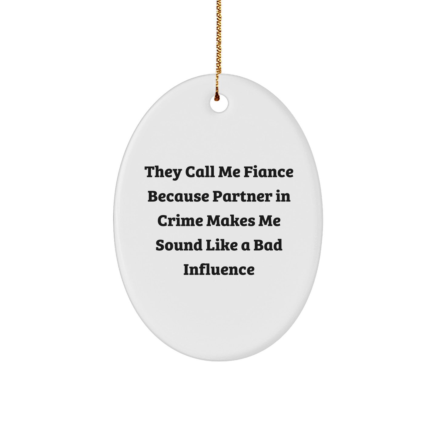 Este adorno ovalado, bellamente elaborado, está hecho de MDF resistente y cuenta con un acabado plástico de alto brillo para diseños duraderos. La frase "Me llaman prometido porque ser cómplice me hace parecer una mala influencia" está impresa de borde a borde mediante sublimación, lo que garantiza colores brillantes y vivos. Es ligero y resistente a las roturas, ideal para hogares con niños o mascotas. Además, incluye un cordón dorado festivo para colgarlo fácilmente, perfecto para decorar sin estrés.