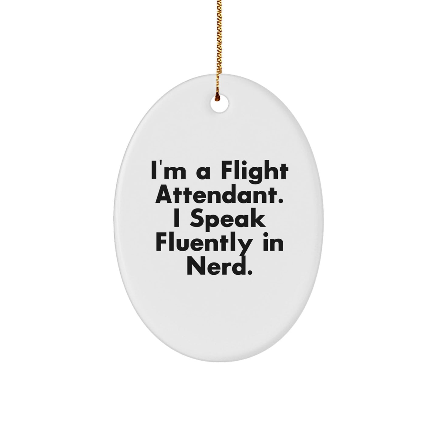 - Este adorno ovalado "Soy auxiliar de vuelo. Hablo con fluidez. Es un regalo único y considerado para cualquier auxiliar de vuelo, y una excelente manera de demostrar tu agradecimiento por su arduo trabajo y dedicación.