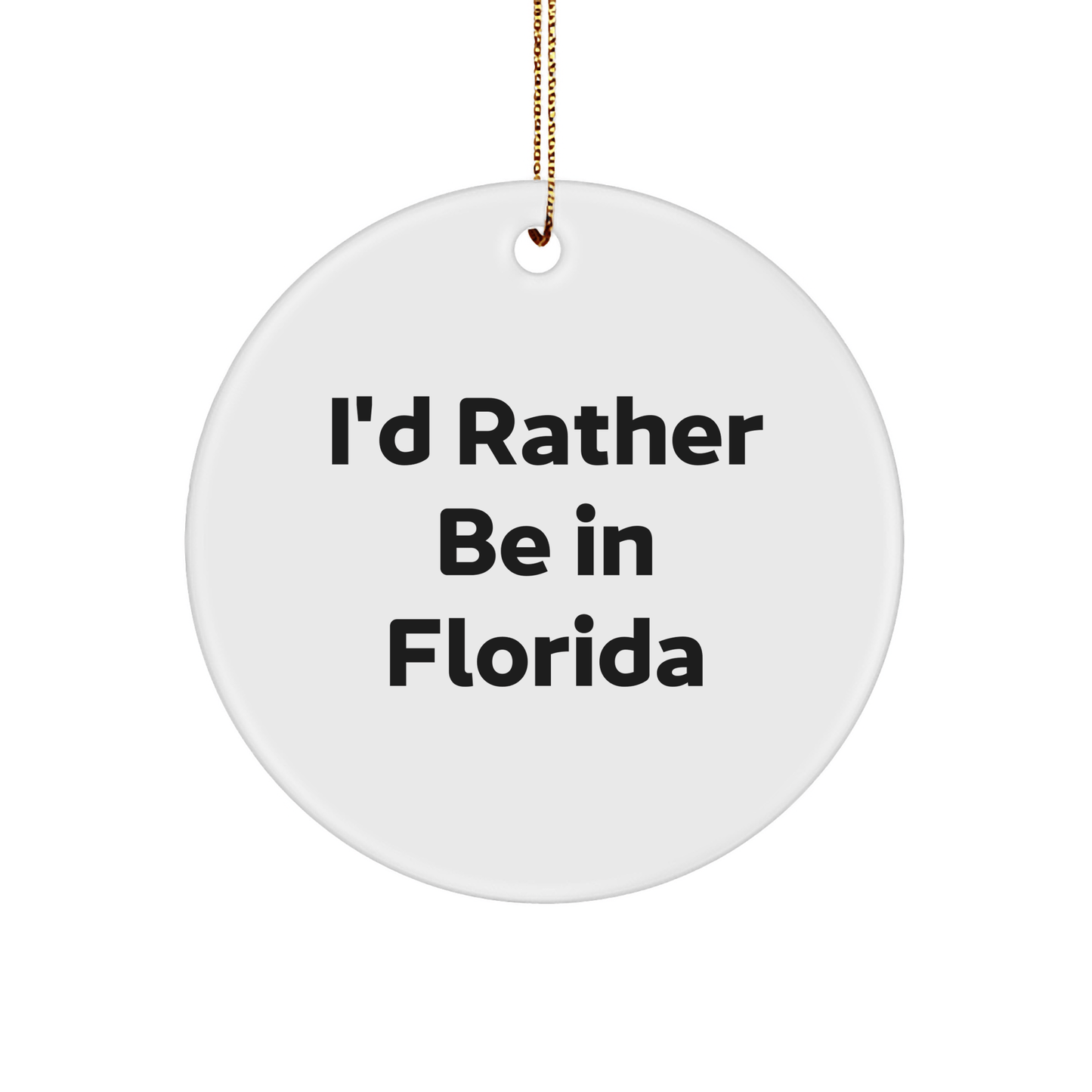 - Lleve un sabor del Estado del Sol a su hogar con este exclusivo adorno circular 'Preferiría estar en Florida', elaborado con MDF resistente con un acabado plástico de alto brillo para diseños duraderos e impresión vibrante de borde a borde.