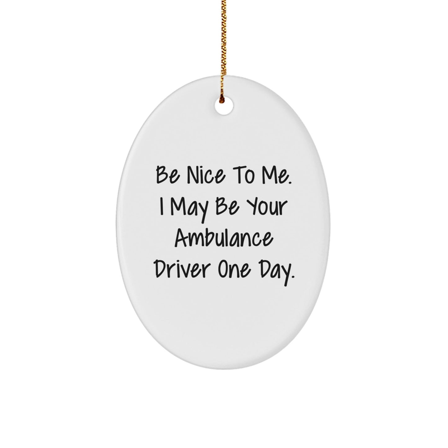 - Este divertido adorno ovalado es un regalo único y considerado para cualquier conductor de ambulancia. Presenta la frase «Sé amable conmigo. Quizás algún día seré tu conductor de ambulancia» en colores brillantes y vivos.