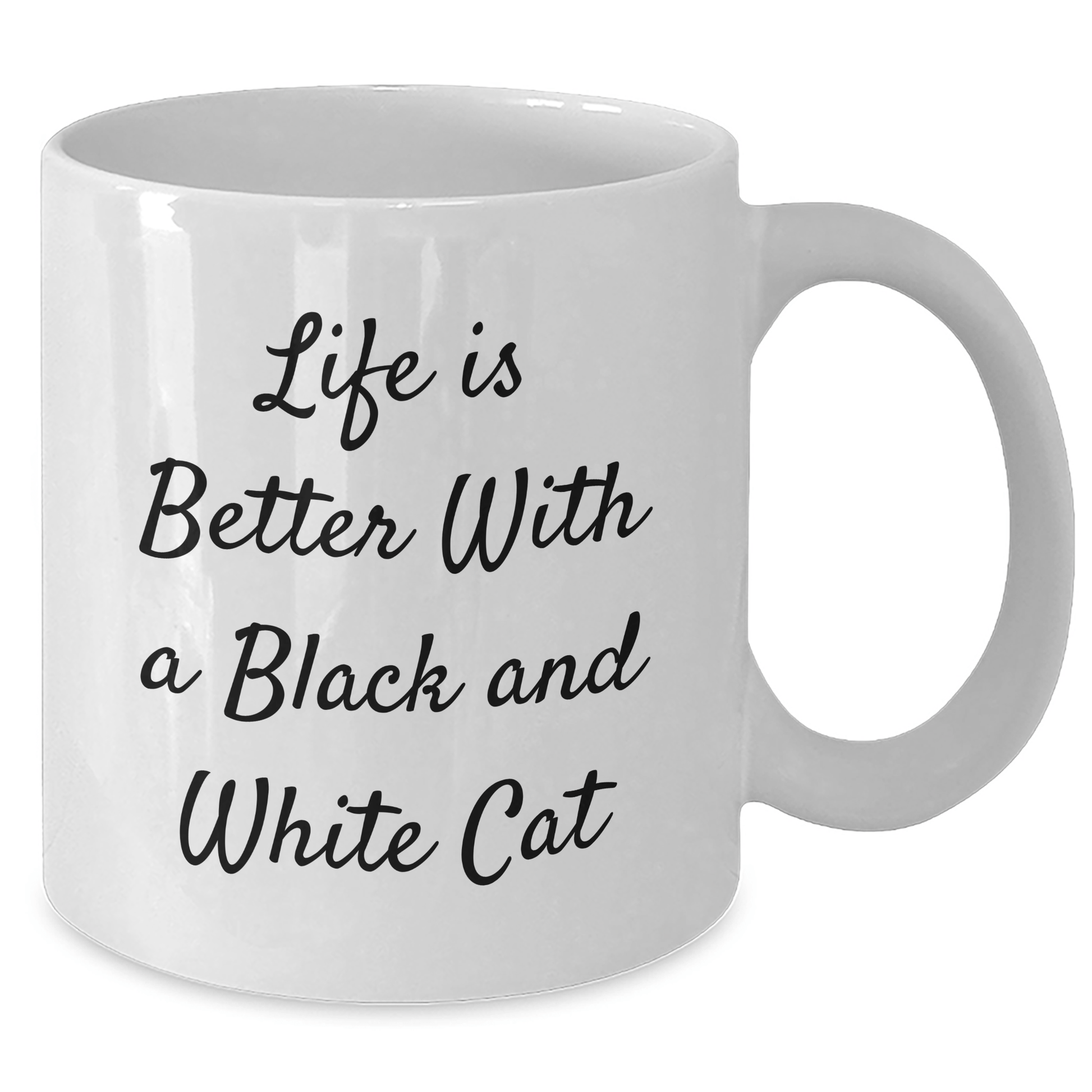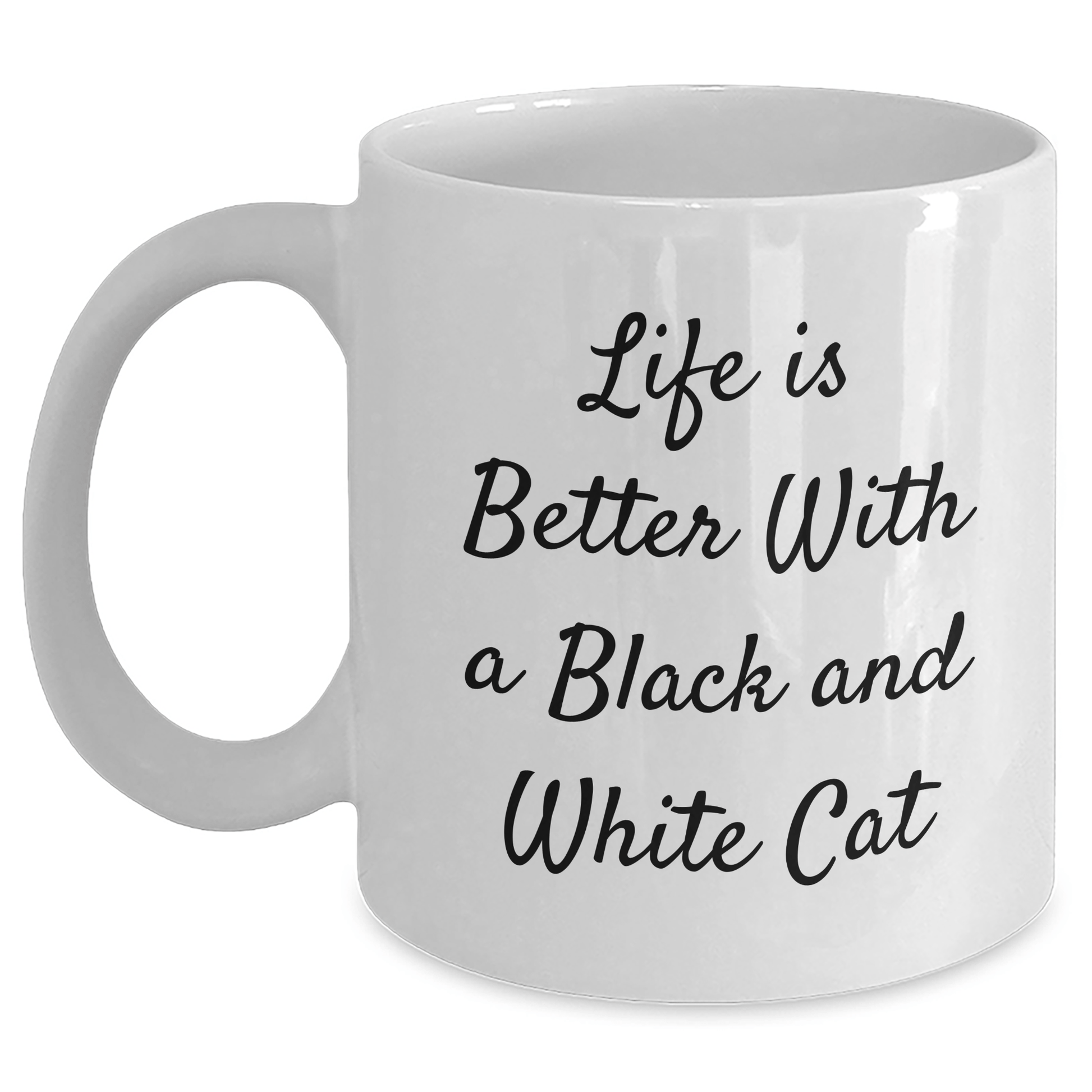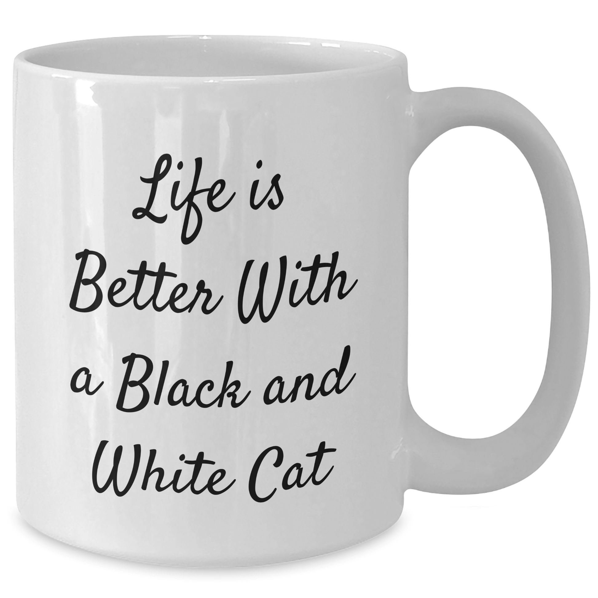 - Esta divertida taza de café con un gato blanco y negro incluye una frase humorística que seguro sacará una sonrisa a cualquier amante de los gatos. La frase dice: «La vida es mejor con un gato blanco y negro».