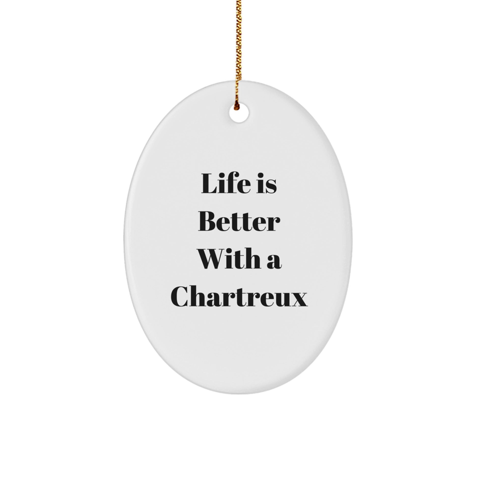 ¿Eres un entusiasta de los gatos Chartreux o buscas un regalo original para un compañero felino? ¡No busques más! Este hermoso adorno ovalado con la frase "La vida es mejor con un Chartreux" es el complemento perfecto para tu decoración navideña o un detalle especial para un dueño de un Chartreux.