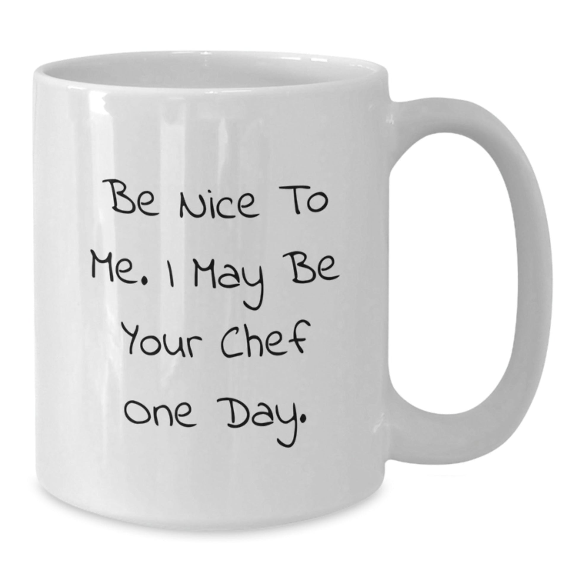 Si buscas un regalo único para el chef de tu vida, ¡no busques más! Esta divertida taza de café con leche es perfecta para cualquier celebración de cumpleaños. La frase "Sé amable conmigo. Quizás algún día seré tu chef" le sacará una sonrisa. Hecha de cerámica de alta calidad, esta taza es apta para microondas y lavavajillas, lo que facilita su limpieza y uso. Ya seas un amigo o un familiar, este regalo seguro que será apreciado. Así que, ¿por qué no demostrarle tu aprecio al chef de tu vida con este detalle tan considerado y divertido?